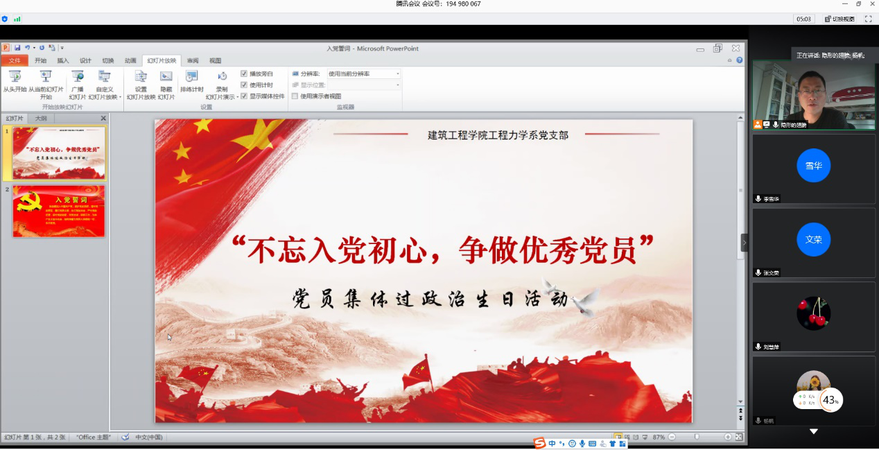 2020年6月30日上午,工程力学党支部通过腾讯会议开展了“党员集体过政治生日”主题党日活动。建筑工程公司党委委员刘慧萍及工程力学党支部全体党员参加了活动。