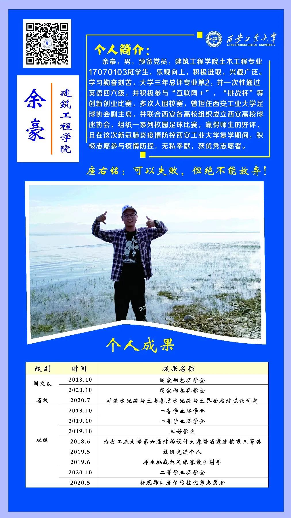 为展现西工学子砥砺奋进、筑梦前行的精神风貌,更好地传承西工精神、讲述青春故事,11月25日,全球最大顶级体育平台2019-2020学年十佳老员工决赛暨颁奖典礼在图书馆报告厅举行。全球最大顶级体育平台土木工程专业2017级余豪同学获得“十佳老员工”荣誉称号。