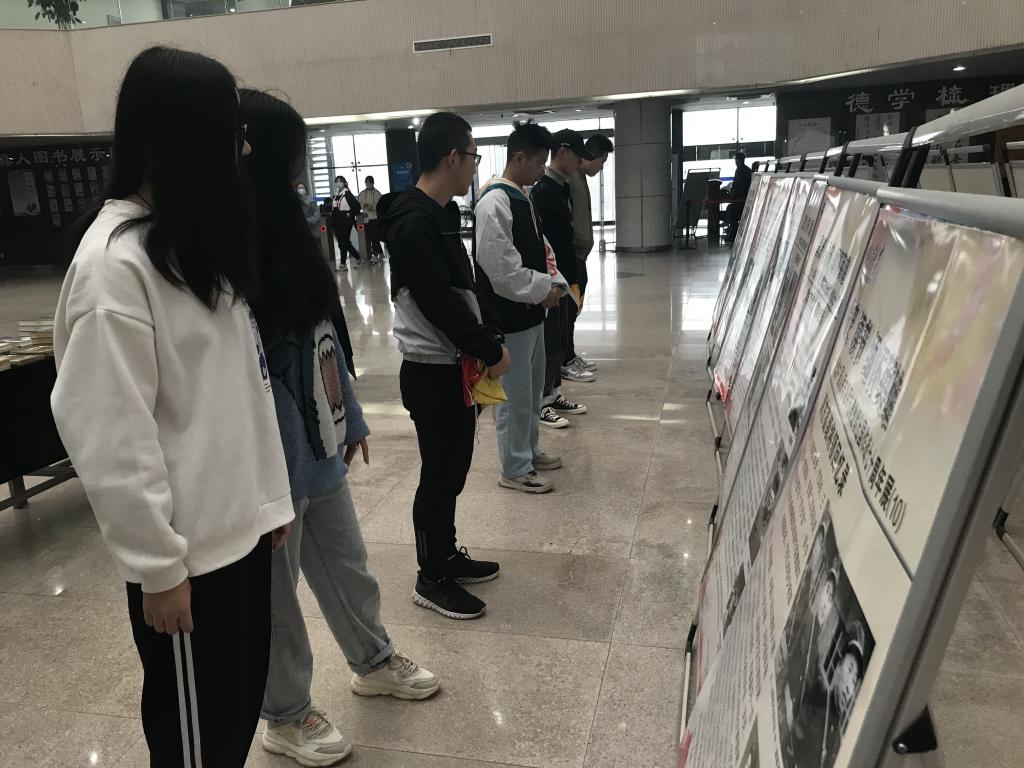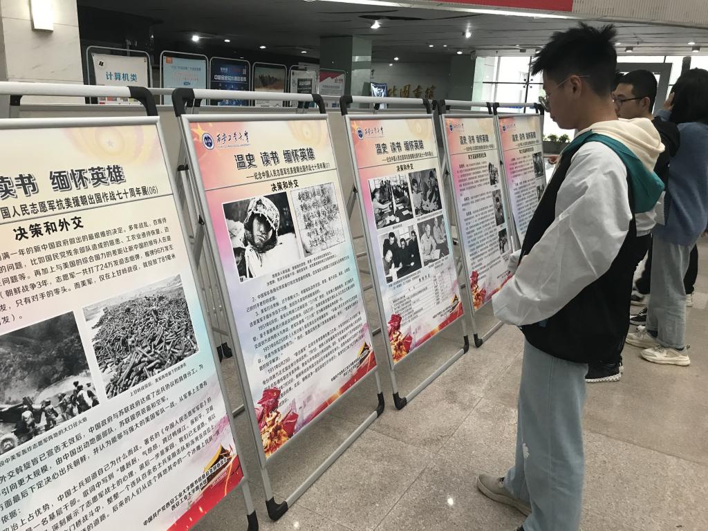 在图书馆二楼大厅,同学们先后参观了抗美援朝图片展、抗美援朝历史研究的图书等资料,通过驻足学习翻阅双方高级将领回忆录、亲历者的回忆评述、中外军史专家的相关研究、经典战例、美国方面的解密档案、双方使用的武器资料以及有关抗美援朝的文学作品等书籍文献详细了解了70年前的峥嵘岁月里志愿军将士保家卫国的可歌可泣的历史,深切缅怀在这场共和国奠基之战中用血肉之躯筑起共和国钢铁长城的“最可爱的人”。
