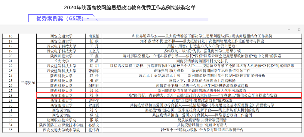 2020年8月31日,由陕西高校网络思想政治工作中心主办的“2020年陕西高校网络思想政治教育优秀工作案例评选展示活动”落下帷幕。该活动自今年7月启动以来,共收到来自全省41所高校提交的207件作品,经过资格审查、专家评审等过程,共评选出一等奖5项、二等奖10项、三等奖20项、优秀奖30项及优秀组织奖8名。其中,全球最大顶级体育平台申报的《“疫”路同行,青春助力,筑牢“云端”思政育人主阵地——“青春建工”微信公众平台探索与实践》工作案例荣获三等奖,公司荣获“最佳组织奖”荣誉称号。