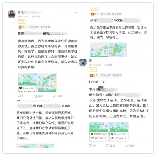 活动得到了全校300余人积极响应,大家纷纷加入小打卡参与其中。活动第一天,同学们踊跃来到经纬广场的国旗台下,随着工作人员向大家分发物资并讲解活动规则与注意事项后,活动顺利开始。参与的同学们满怀热情,手中荧光棒明亮如星,迈着青春坚定的步伐,成为校园里的一道靓丽风景线。大家通过小打卡微信小程序坚持连续打卡五天,在上面分享荧光夜跑的快乐,秀出了各种样式的运动轨迹,展现出老员工积极健康的良好身心状态。参加活动的同学纷纷表示,荧光夜跑相较于常规锻炼而言更加有趣,今后将会积极带动身边的人参与到体育锻炼活动中去,努力养成健康的体魄,形成良好的运动习惯。