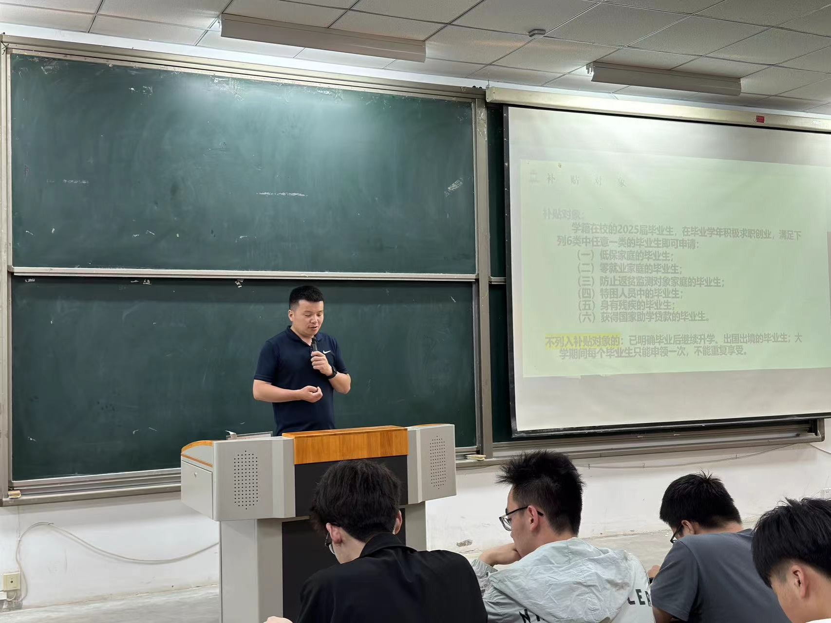 会议伊始,辅导员刘冬带领同学们认真解读文件精神,了解相关政策,向同学们介绍发放对象。同时,他还对发放标准、申领程序、申请材料三方面进行详细说明。随后,他还强调毕业生要根据自身情况,认真填写个人资料,确保材料的真实性和可靠性。