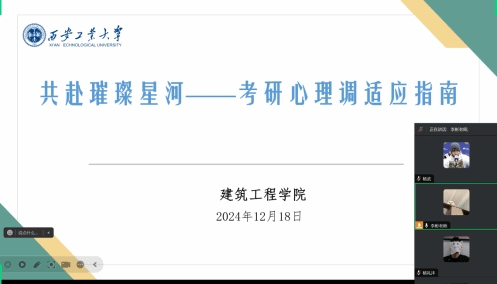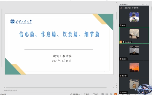 毕业班辅导员李彬以“弘扬法律精神,杜绝考试作弊”为主题,领学了考试的相关法律法规,着重强调了考试作弊的严重后果;同时以考研报考数据和实际案例,为同学们提供了一系列实用的心理调适技巧;针对考试信心、作息、饮食以及细节,给同学们提出了相应的建议。