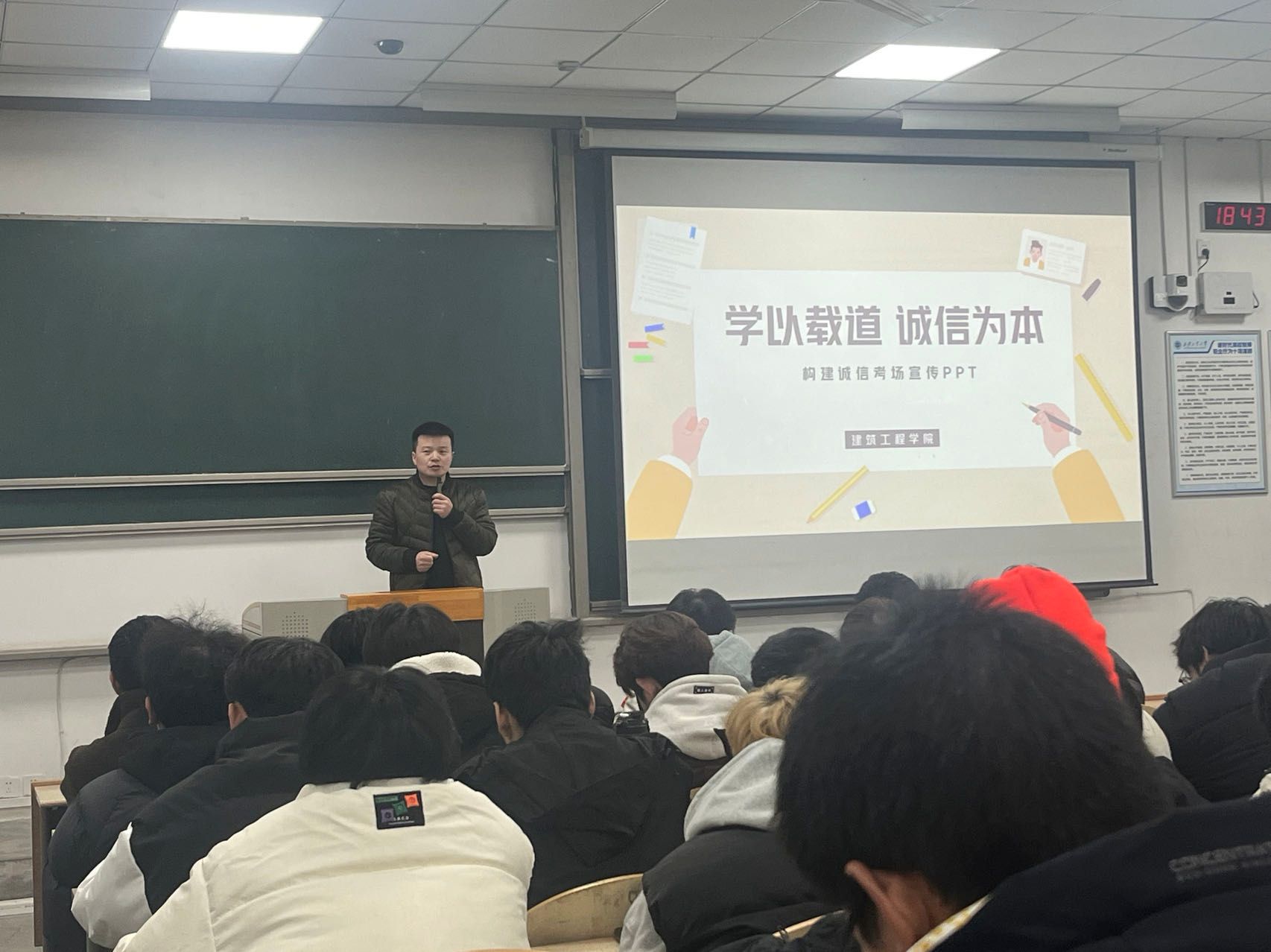 12月24日,2023级在教1-101教室开展“学以载道,诚信为本”考前诚信教育,辅导员刘冬主持,年级全体员工参与。