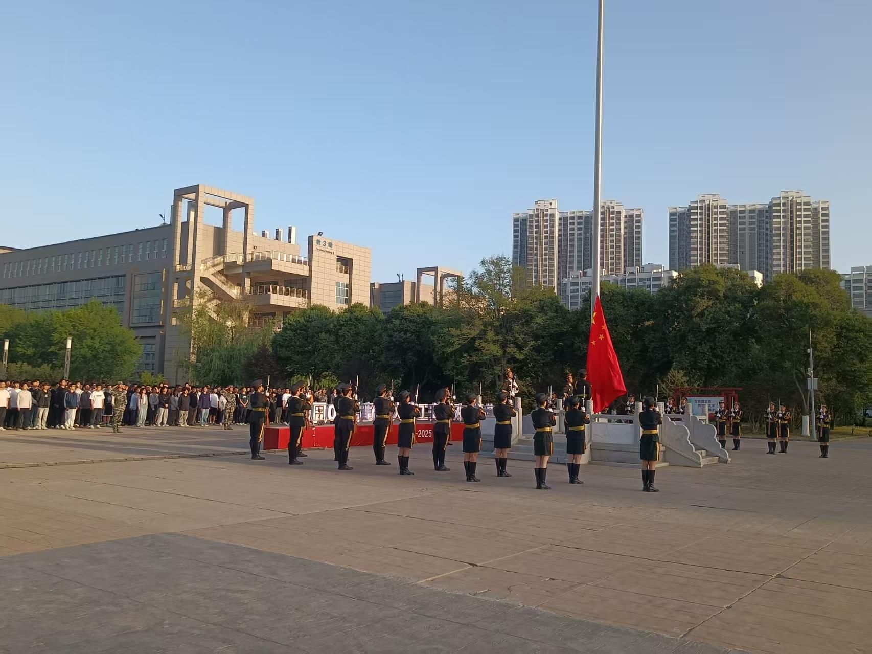 晨光中,国旗护卫队迈着铿锵步伐护送五星红旗入场。伴随着激昂的《义勇军进行曲》,全体师生肃立注目,齐声高唱国歌。鲜红的国旗冉冉升起,与“忠诚进取、精工博艺”的校训交相辉映,昭示着西工人七十年如一日的家国担当。