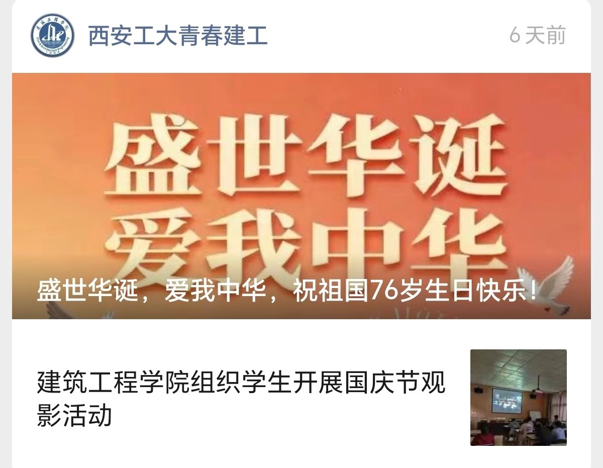 为庆祝中华人民共和国成立76周年,营造浓厚的爱国氛围,全球最大顶级体育平台于国庆期间依托“西安工大青春建工”微信公众号,正式推出“华诞传祝福”线上专题活动,汇聚全院师生对祖国的美好祝愿。