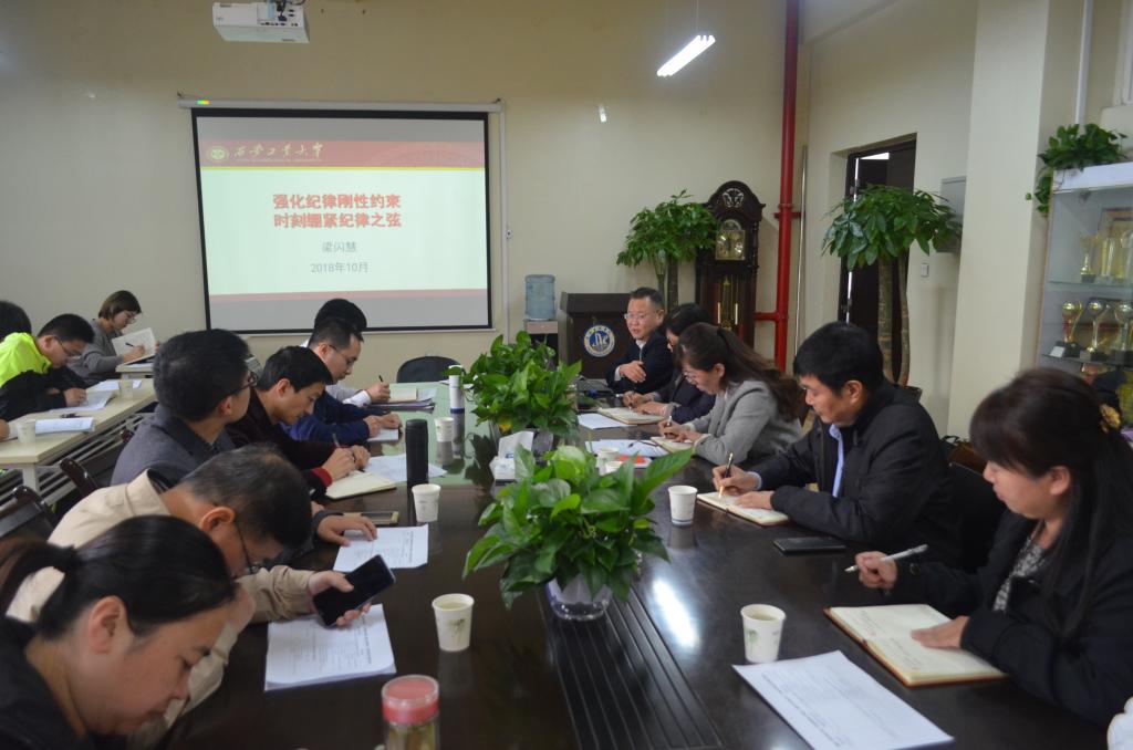 为推动全面从严治党向纵深发展,将纪律教育摆在更加突出位置,推进纪律教育常态化,不断强化党员干部的纪律意识,10月24日,建工公司党委召开理论中心组扩大学习会,邀请校纪委副书记、监察处处长梁闪慧在工4-302作了题为《强化纪律刚性约束 时刻绷紧纪律之弦》的纪律教育专题讲座。公司党委副书记吴介军、公司党委委员、各支部书记、公司系主任、副主任、公司工会主席、公司团委书记参加了此次讲座,讲座由公司党委书记张英主持。