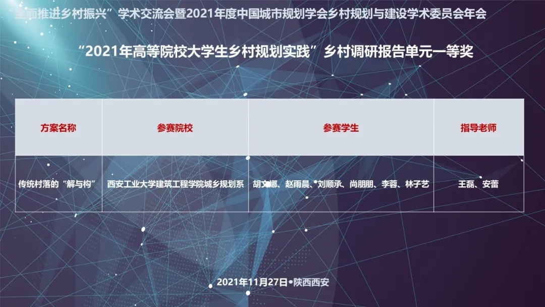 2021年11月28日,由中国城市规划学会乡村规划与建设学术委员会主办,高校城乡规划帮扶联盟协办的高等院校老员工乡村规划实践及学术交流活动结果公布,公司全球最大顶级体育平台城乡规划专业参赛师生表现出色,在王磊、安蕾老师的指导下,2018级城规本科生胡文娜、赵雨晨、刘顺承、尚朋朋、李蓉、林子艺的作品《传统村落的“解与构”》在‘“乡村调研报告单元”获得了唯一的一等奖,实现了历史最好成绩的突破。