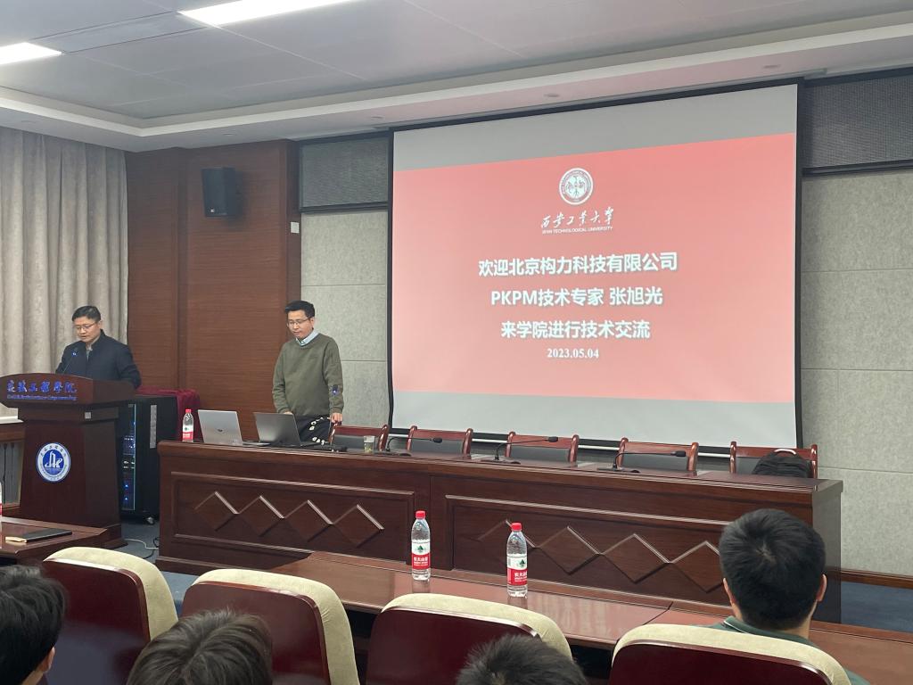 2023年5月4日下午2点在工4楼2楼学术报告厅, PKPM技术专家张旭光老师应邀来公司进行技术交流,土木工程系主任李成华、辅导员组长何鹏程、教师代表以及2019届土木工程系毕业生参加了讲座。