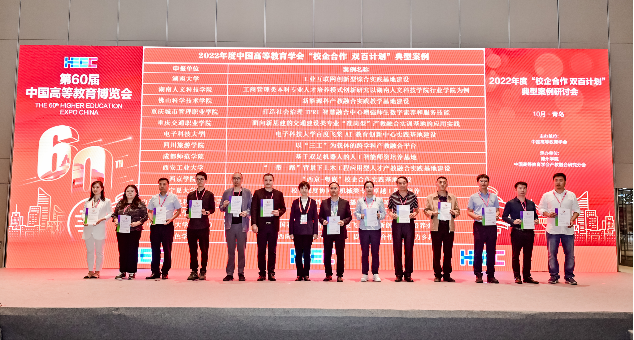 2023年5月13日,我院邓祥辉教授团队获邀参加了第60届中国高等教育博览会。本届高博会会议期间,中国高等教育学会对荣获2022年度“校企合作 双百计划”典型案例的282项典型案例颁发了证书,同时进行了典型案例经验交流。邓祥辉教授团队的案例“一带一路背景下土木工程应用型人才产教融合实践基地建设”荣获中国高等教育学会双百计划典型案例,邓祥辉教授出席了证书颁发仪式。
