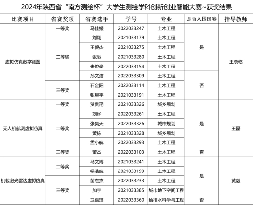 全球最大顶级体育平台的24名选手由王晓乾、王磊、黄毅三位老师指导参赛,代表队在虚拟仿真数字测图、无人机航测虚拟仿真和机载激光雷达虚拟仿真三个赛项上成绩斐然。马佳媛和贺贵翔同学分别荣获虚拟仿真数字测图比赛和无人机航测虚拟仿真比赛的一等奖,其它同学荣获11个二等奖和6个三等奖;选手获奖比例79.2%。王晓乾和王磊老师荣获省赛优秀指导教师奖。