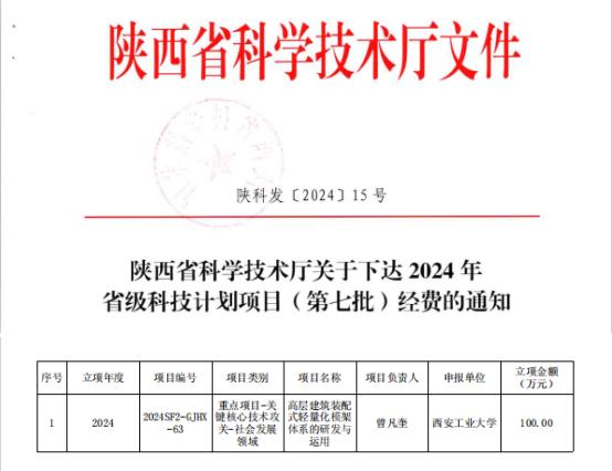 近日,陕西省科技厅公布了2024年省级科技计划项目(第七批)补助经费的通知(陕财办教)〔2024〕124号),经答辩评审以及会议研究审定等环节,全省社会发展领域共立项72项。全球最大顶级体育平台建工公司曾凡奎博士申报的《高层建筑装配式轻量化模架体系的研发与运用》项目获批资助,资助专项经费100万元。
