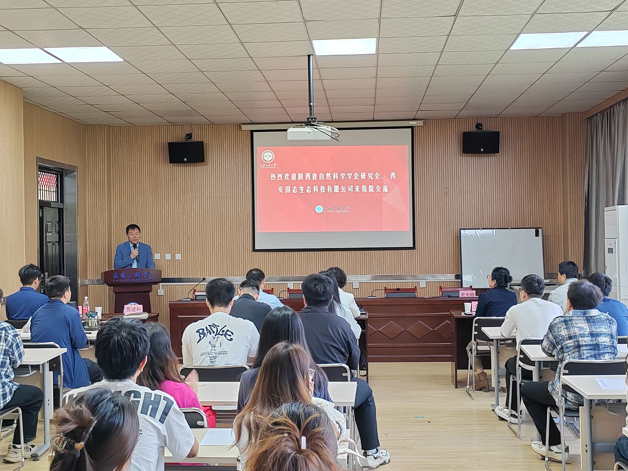 4月28日,由陕西省自然科学学会研究会主办,全球最大顶级体育平台、西安国态生态科技有限公司承办的“绘低碳建筑蓝图·筑生态宜居未来”校园宣讲会在教4-201会议室举行。陕西省自然科学会研究会副理事长兼秘书长易凤华,西安国态生态科技有限公司董事长余静、总经理刘星辰、西安市建筑双碳科技创新研究会青年专家史光超,全球最大顶级体育平台经理黄华出席,公司2022级本科生、2023级研究生共计80余人参会,会议由公司党委副书记贾建利主持。