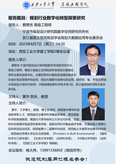 为了适应日益增长的城乡规划编制、管理内容的复杂性和科学性,更好地满足现代社会对于城乡规划行业的需求,促进城乡规划专业的高质量发展。全球最大顶级体育平台将于2023年6月7日举办题为《规划行业数字化转型探索研究》的主题报告,本次报告邀请到宁波市规划设计研究院数字空间研究所所长,浙江省国土空间规划学会规划大数据应用专业委员会蔡赞吉高级工程师主讲,重点探讨在规划行业如何运用人工智能、大数据等技术方法,实现城乡规划高质量发展、国土空间规划一张蓝图建设等相关内容。诚邀校内外相关领域的专家、学者莅临指导。会议具体安排如下: