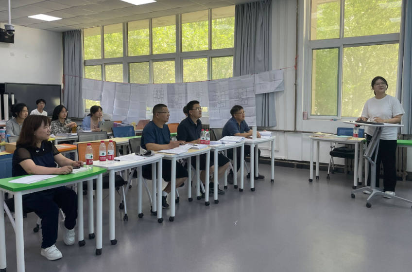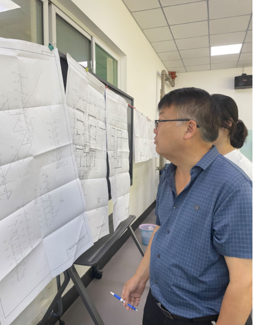在答辩过程中,所有图纸均悬挂于教室两侧进行展示,员工通过PPT结合图纸汇报了四年来的学习成果。葛万斌高工利用多年的实践经验,现场对员工的成果进行点评,并与答辩组的教师进行探讨交流。20级的员工通过观摩加深了对专业的认知,对后续的专业课学习以及即将面临的毕业设计提供了巨大的帮助。