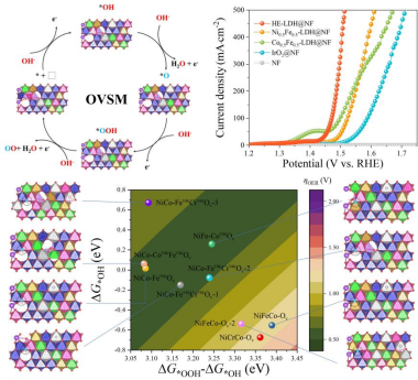 如何调控晶格氧氧化机制活性与稳定性之间存在的固有矛盾,成为当前碱性电解水制氢技术发展的核心问题。论文基于理论计算及原位电化学分析,阐明了多种金属空位与氧空位的集成有效优化了锚定于镍活性位点含氧中间体的吸附自由能,进而激活了高熵水滑石电催化剂的氧空位位点机制,实现了电解水性能活性与稳定性的共赢。