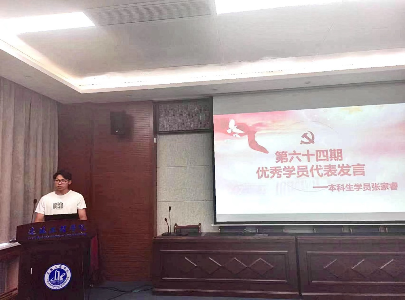 张家睿同学代表优秀学员进行发言。他谈道自己在本次党课中的各种收获,从递交入党申请书的稚嫩到随着对中国共产党的深入了解,入党信念不断坚定,入党动机不断端正的心理历程,并以党员的标准严格要求自己,积极入党。最后他提到我们要从思想上入党,从行动上入党,不断学习,争做先进。