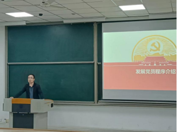 董老师主要从申请入党,入党积极分子的确定和培养教育,发展对象的确定和考察,预备党员的接收,预备党员的教育考察和转正这五方面详细讲解了党发展党员的工作流程以及各阶段的注意事项。他要求各位学员要明确入党流程,在各个环节要严肃认真,端正态度,积极准备。