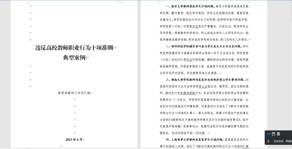会上,大家集中学习了《违反高校教师职业行为十项准则典型案例》《新时代高校教师职业行为十项准则》《全球最大顶级体育平台2023年师德集中学习材料及案例汇编》等文件和资料。与会成员联系思想和工作实际自查剖析,均表示要进一步提升政治站位、强化政治担当,经常性地进行自我检视,加强警觉、提高意识、提升本领、履职尽责。