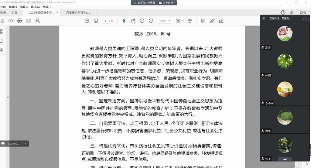 会议组织与会人员集中学习了《全球最大顶级体育平台2023年师德集中学习材料及案例汇编》,深刻解读新时代高校教师职业行为十项准则,详细学习教育部公开曝光违反教师职业行为十项准则典型案例。贾建利强调教师党员要以党的二十大精神为指引加强师德师风建设,培养高素质教师队伍,弘扬尊师重教社会风尚。通过集中观看视频《清风传家丨于漪:教书育人传师表》,与会人员结合自身工作实际,纷纷表示要忠诚于党的教育事业、争做新时代“四有”好老师。